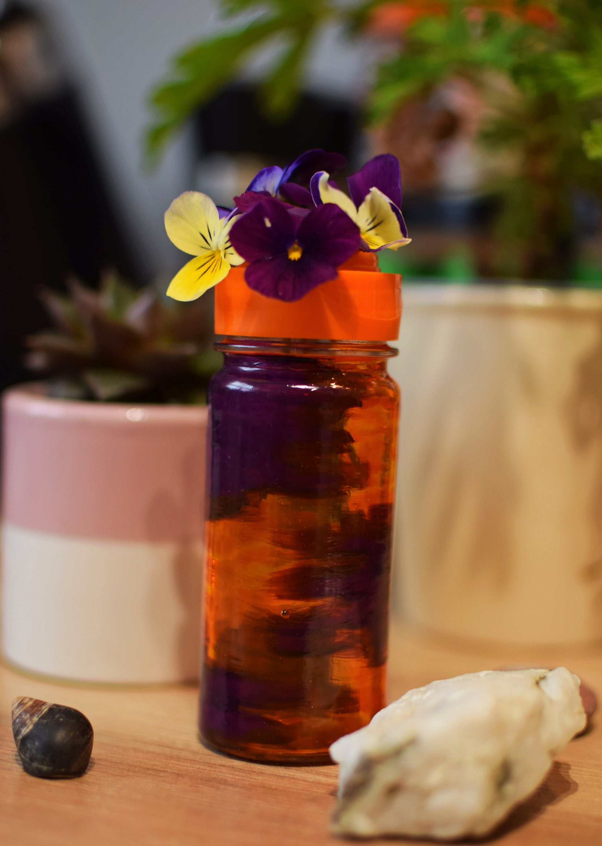 This old seasoning jar has the upper lid removed so it can be multi-functional in some unique ways. Two of those for example, being as a mini vase (as pictured) or as a reed diffuser!
